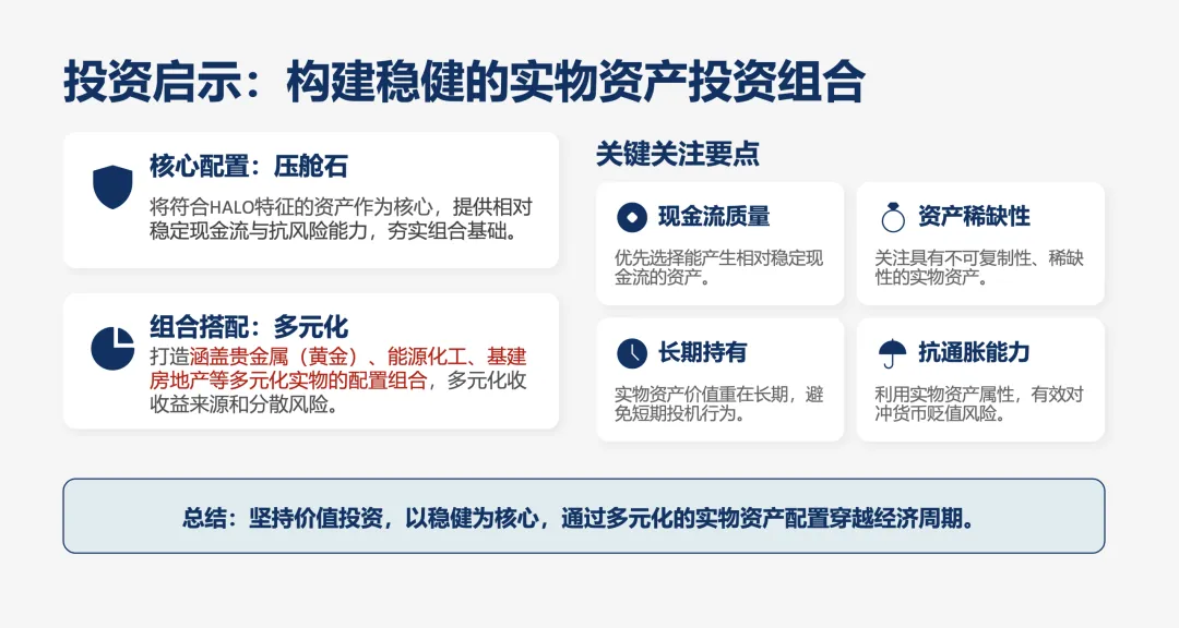 构建实物资产投资组合,要以稳健为核心,通过多元化的实物资产配置穿越经济周期。以HALO特征资产为核心压舱石,打造涵盖贵金属、能源化工、基建房地产等多元化实物的配置组合,多元化收益来源和分散风险,也可采用风险平价策略均衡不同资产的风险贡献。配置中需聚焦现金流质量、资产稀缺性,坚持长期持有,同时也要警惕潜在风险,包括流动性、周期波动、政策监管、技术替代及地缘冲突带来的运营风险,需全面评估、动态调整配置比例。