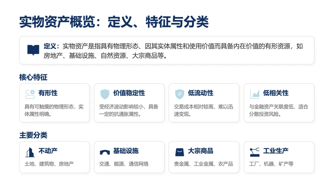 从定义上说,顾名思义,与“虚”对应,实物资产是更为“实”的资产,其为具有物理形态、依托实体属性和使用价值形成内在价值的有形资源。从分类上看,房地产、基础设施、自然资源、大宗商品等均为典型的实物资产的代表。