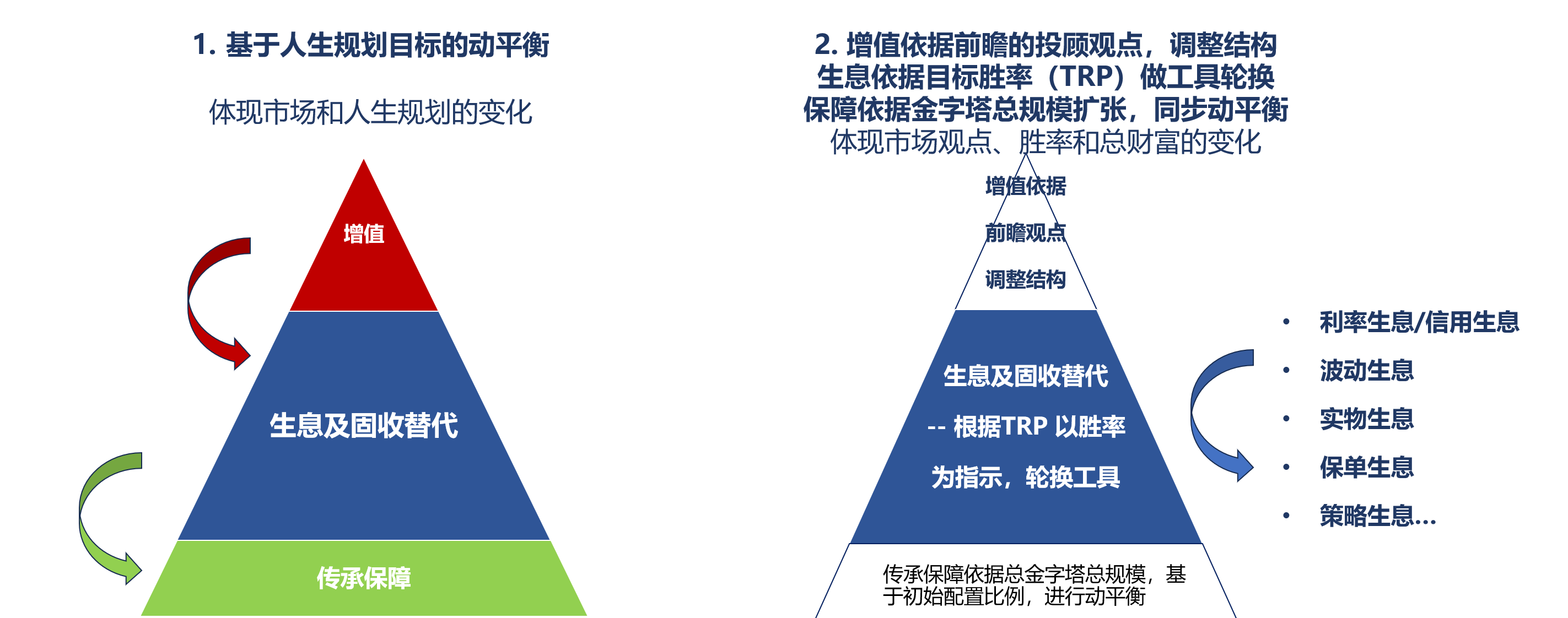 资本市场周期涨跌带来的动平衡:增值部分的配置会随着资本市场的牛熊周期,阶段性会出现明显超出或者低于自身需求的比例,应该“削峰填谷”,回归到目标比例。
