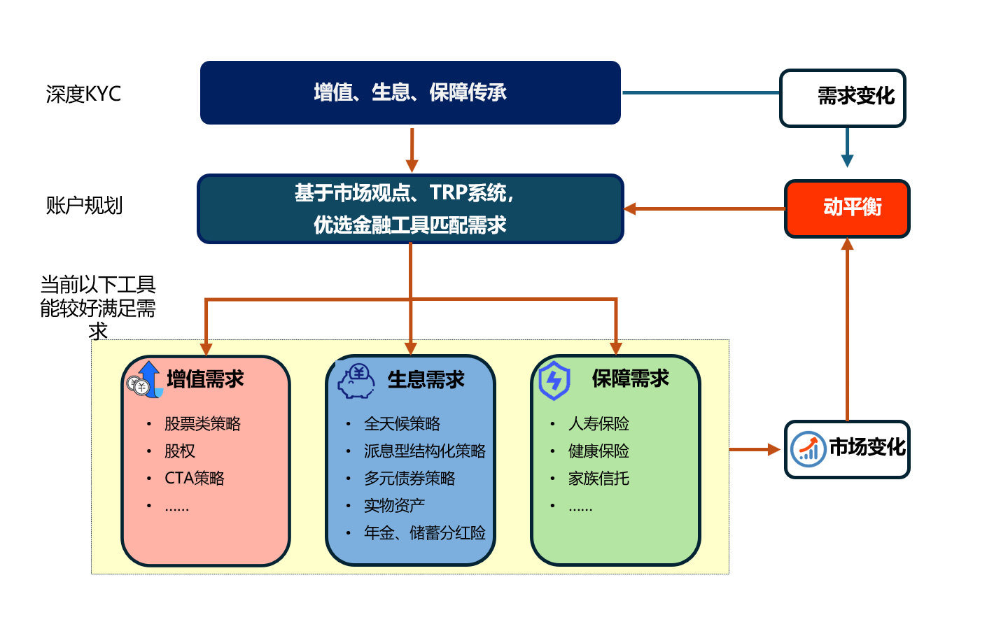 第二层是产品匹配,参考TRP系统和市场观点进行工具和策略的选择—— 在规划框架内灵活调整,是财富管理的 “目”。纲举目张。从卖产品到建账户,让账户表现穿越周期。