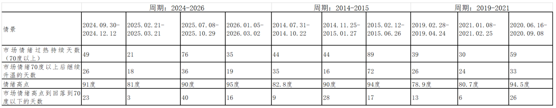(2)市场情绪到了70度后,可能还会继续上冲,这个阶段也往往比较短暂,最长只有72天;