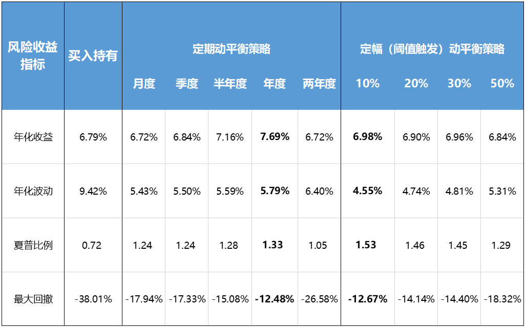 对于普通投资者而言,比较简单易行的方法就是每年做一次动平衡,把配置比例回归到期初目标配置,从长期来看,不仅能够降低波动和回撤,还能提升预期回报。