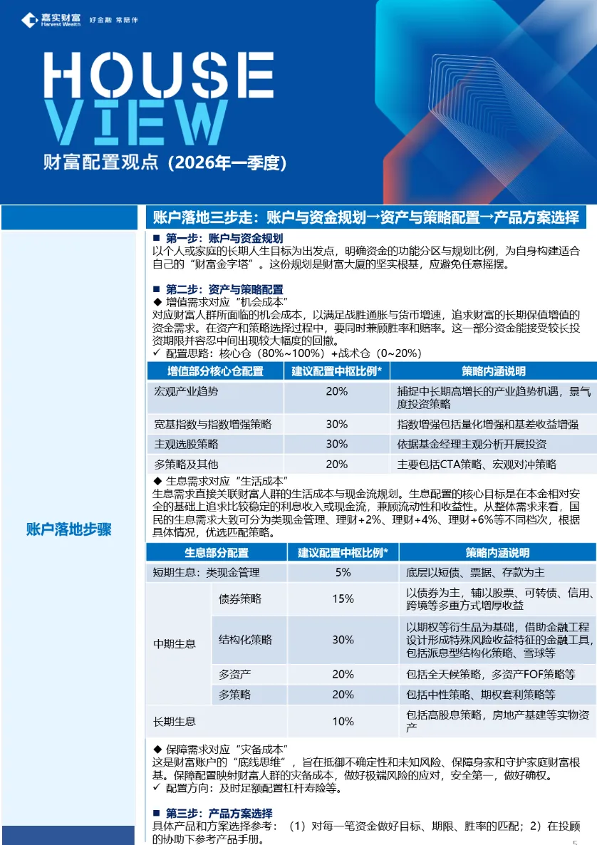 账户思维的具体落地,嘉实财富公司层面在万里行和2026年Q1House View也相继发布,具体包括:账户与资金规划、资产与策略配置以及产品解决方案选择等三步走方法。