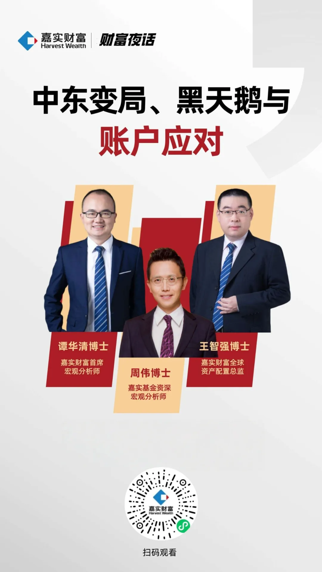 嘉宾:嘉实基金资深宏观分析师周伟博士、嘉实财富全球资产配置总监王智强博士、嘉实财富首席宏观分析师谭华清博士