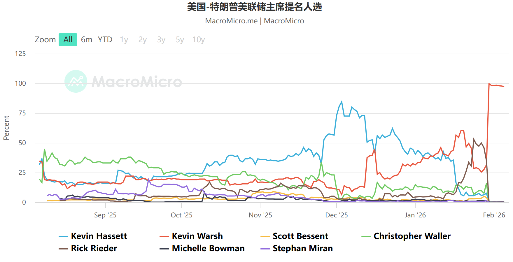事实上,美联储新任主席的人选一波三折,提名人的名单一度经历较大的变动,如下图所示,直到最后一刻之前,凯文・沃什才从竞选人当中脱颖而出,最终获得提名,而其他的参与者,包括白宫国家经济委员会主任哈塞特,贝莱德高级董事总经理里德尔等,也曾经一度占据领先的身位。