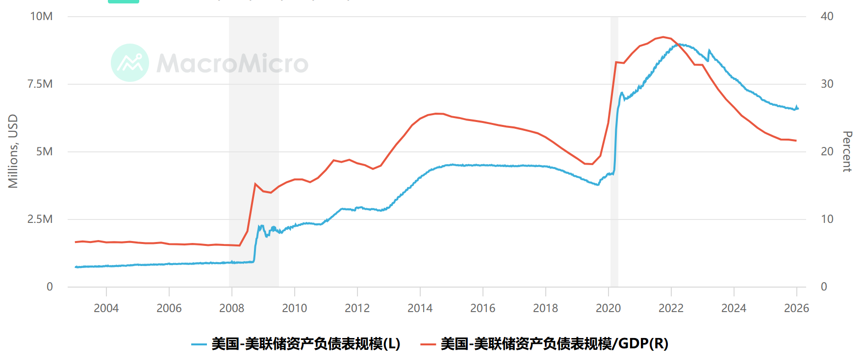 图4:美联储资产负债表规模(百万美元) & 资产负债表规模占GDP比例(%)