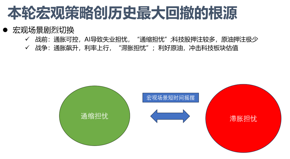 战争的发生具有一定突然性,即使具有宏观判断能力的基金经理也缺少足够的应对时间,意识到时就已经出现资产的大跌了。这种意外和战争发生之前的叙事不同,容易造成资产的巨幅波动。如果在战争前就已经处于滞胀环境,可能有策略提前部署了受益战争的方向。但此次战争前,市场总体预期是通胀回落、油价低迷。所以,本轮战争的突然发生,宏观场景在短时间内出现“剧烈”抖动,让宏观策略难以有效应对,即使后期多措并举,也不免出现回撤。